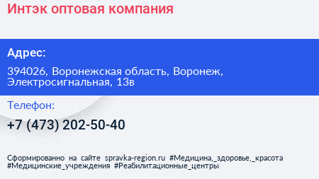 Интэк, оптовая компания по адресу 394026, Воронежская область, Воронеж, Электросигнальная, 13в в дальнейшем Организация, размещена в следующих категориях: