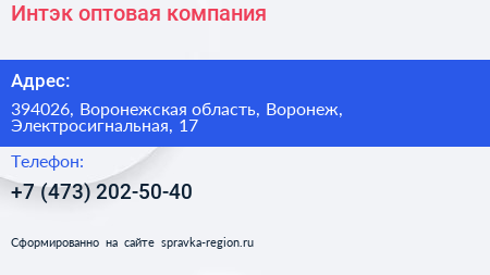 Интэк, оптовая компания по адресу 394026, Воронежская область, Воронеж, Электросигнальная, 17 в дальнейшем Организация, размещена в следующих категориях: