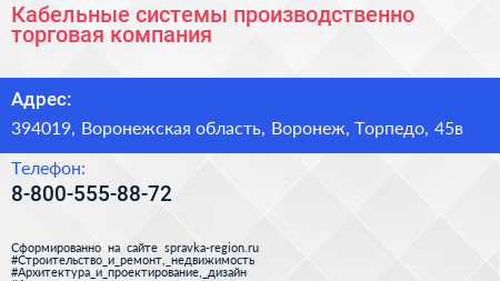 Кабельные системы, производственно-торговая компания по адресу 394019, Воронежская область, Воронеж, Торпедо, 45в в дальнейшем Организация, размещена в следующих категориях: