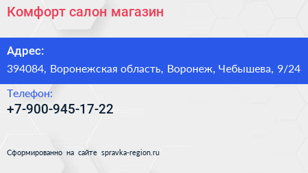 Комфорт, салон-магазин по адресу 394084, Воронежская область, Воронеж, Чебышева, 9/24 в дальнейшем Организация, размещена в следующих категориях: