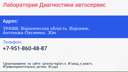 Лаборатория Диагностики, автосервис по адресу 394088, Воронежская область, Воронеж, Антонова-Овсеенко, 30м в дальнейшем Организация, размещена в следующих категориях: