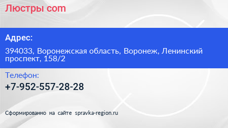 Люстры.com по адресу 394033, Воронежская область, Воронеж, Ленинский проспект, 158/2 в дальнейшем Организация, размещена в следующих категориях: