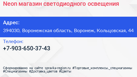 Neon, магазин светодиодного освещения по адресу 394030, Воронежская область, Воронеж, Кольцовская, 44 в дальнейшем Организация, размещена в следующих категориях: