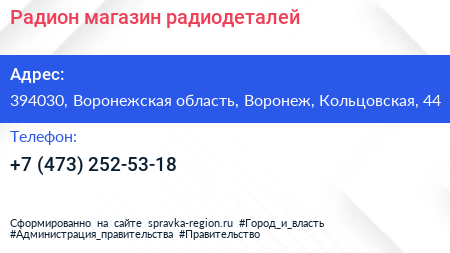 Радион, магазин радиодеталей по адресу 394030, Воронежская область, Воронеж, Кольцовская, 44 в дальнейшем Организация, размещена в следующих категориях: