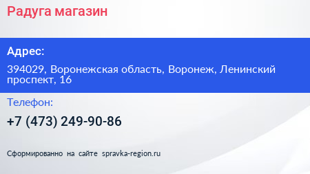Радуга, магазин по адресу 394029, Воронежская область, Воронеж, Ленинский проспект, 16 в дальнейшем Организация, размещена в следующих категориях: