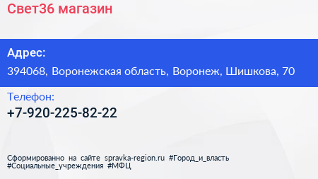Свет36, магазин по адресу 394068, Воронежская область, Воронеж, Шишкова, 70 в дальнейшем Организация, размещена в следующих категориях:
