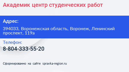 Академик, центр студенческих работ по адресу 394033, Воронежская область, Воронеж, Ленинский проспект, 119а в дальнейшем Организация, размещена в следующих категориях: