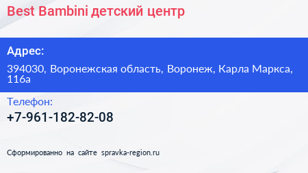 Best Bambini, детский центр по адресу 394030, Воронежская область, Воронеж, Карла Маркса, 116а в дальнейшем Организация, размещена в следующих категориях: