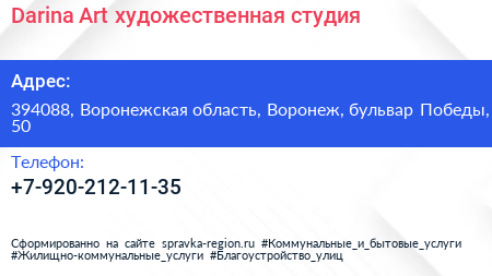 Darina Art, художественная студия по адресу 394088, Воронежская область, Воронеж, бульвар Победы, 50 в дальнейшем Организация, размещена в следующих категориях: