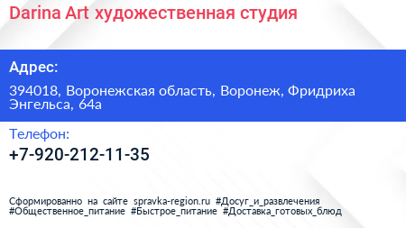 Darina Art, художественная студия по адресу 394018, Воронежская область, Воронеж, Фридриха Энгельса, 64а в дальнейшем Организация, размещена в следующих категориях: