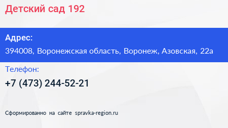 Детский сад №192 по адресу 394008, Воронежская область, Воронеж, Азовская, 22а в дальнейшем Организация, размещена в следующих категориях: