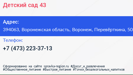 Детский сад №43 по адресу 394063, Воронежская область, Воронеж, Перевёрткина, 50 в дальнейшем Организация, размещена в следующих категориях: