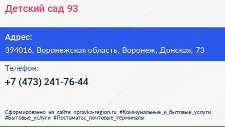 Детский сад №93 по адресу 394016, Воронежская область, Воронеж, Донская, 73 в дальнейшем Организация, размещена в следующих категориях: