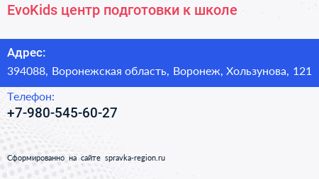EvoKids, центр подготовки к школе по адресу 394088, Воронежская область, Воронеж, Хользунова, 121 в дальнейшем Организация, размещена в следующих категориях: