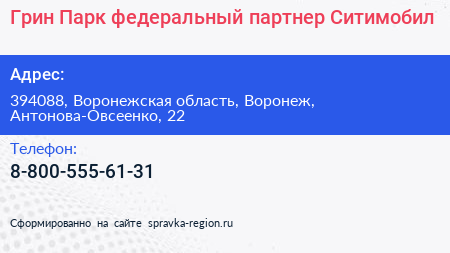 Грин Парк, федеральный партнер Ситимобил по адресу 394088, Воронежская область, Воронеж, Антонова-Овсеенко, 22 в дальнейшем Организация, размещена в следующих категориях: