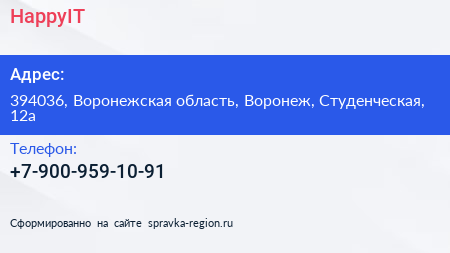 HappyIT по адресу 394036, Воронежская область, Воронеж, Студенческая, 12а в дальнейшем Организация, размещена в следующих категориях: