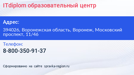 ITdiplom, образовательный центр по адресу 394026, Воронежская область, Воронеж, Московский проспект, 11/46 в дальнейшем Организация, размещена в следующих категориях: