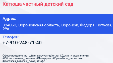 Катюша, частный детский сад по адресу 394050, Воронежская область, Воронеж, Фёдора Тютчева, 99а в дальнейшем Организация, размещена в следующих категориях: