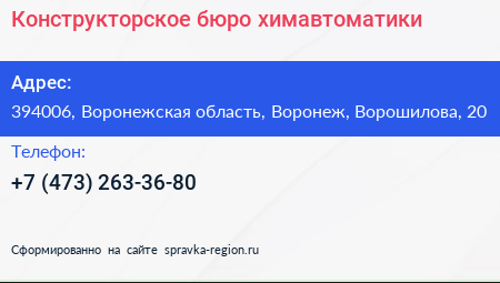 Конструкторское бюро химавтоматики по адресу 394006, Воронежская область, Воронеж, Ворошилова, 20 в дальнейшем Организация, размещена в следующих категориях: