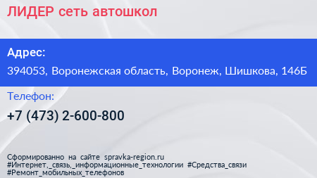 ЛИДЕР, сеть автошкол по адресу 394053, Воронежская область, Воронеж, Шишкова, 146Б в дальнейшем Организация, размещена в следующих категориях: