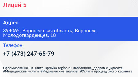 Лицей №5 по адресу 394065, Воронежская область, Воронеж, Молодогвардейцев, 18 в дальнейшем Организация, размещена в следующих категориях: