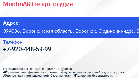 MontmARTre, арт-студия по адресу 394036, Воронежская область, Воронеж, Орджоникидзе, 8 в дальнейшем Организация, размещена в следующих категориях: