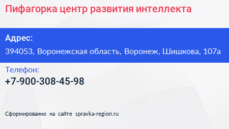 Пифагорка, центр развития интеллекта по адресу 394053, Воронежская область, Воронеж, Шишкова, 107а в дальнейшем Организация, размещена в следующих категориях: