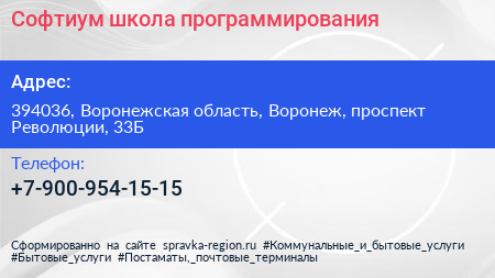 Софтиум, школа программирования по адресу 394036, Воронежская область, Воронеж, проспект Революции, 33Б в дальнейшем Организация, размещена в следующих категориях: