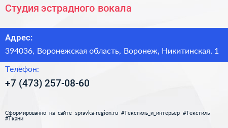 Студия эстрадного вокала по адресу 394036, Воронежская область, Воронеж, Никитинская, 1 в дальнейшем Организация, размещена в следующих категориях:
