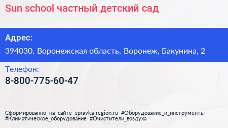 Sun school, частный детский сад по адресу 394030, Воронежская область, Воронеж, Бакунина, 2 в дальнейшем Организация, размещена в следующих категориях: