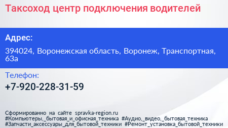 Таксоход, центр подключения водителей по адресу 394024, Воронежская область, Воронеж, Транспортная, 63а в дальнейшем Организация, размещена в следующих категориях: