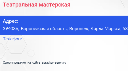 Театральная мастерская по адресу 394036, Воронежская область, Воронеж, Карла Маркса, 53 в дальнейшем Организация, размещена в следующих категориях: