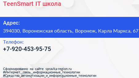TeenSmart, IT-школа по адресу 394030, Воронежская область, Воронеж, Карла Маркса, 67 в дальнейшем Организация, размещена в следующих категориях: