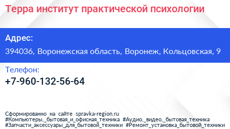 Терра, институт практической психологии по адресу 394036, Воронежская область, Воронеж, Кольцовская, 9 в дальнейшем Организация, размещена в следующих категориях:
