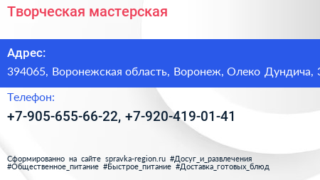 Творческая мастерская по адресу 394065, Воронежская область, Воронеж, Олеко Дундича, 3 в дальнейшем Организация, размещена в следующих категориях: