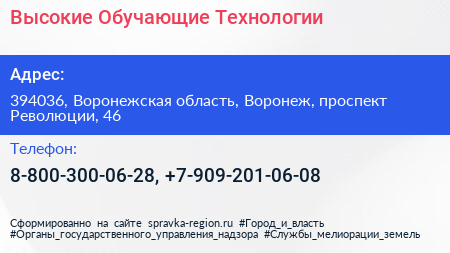 Высокие Обучающие Технологии по адресу 394036, Воронежская область, Воронеж, проспект Революции, 46 в дальнейшем Организация, размещена в следующих категориях: