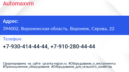Automaxvrn по адресу 394002, Воронежская область, Воронеж, Серова, 22 в дальнейшем Организация, размещена в следующих категориях: