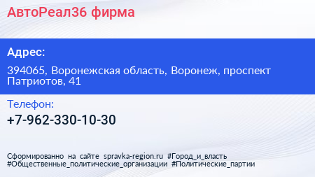 АвтоРеал36, фирма по адресу 394065, Воронежская область, Воронеж, проспект Патриотов, 41 в дальнейшем Организация, размещена в следующих категориях: