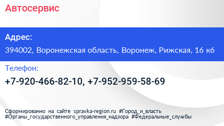 Автосервис по адресу 394002, Воронежская область, Воронеж, Рижская, 16 к6 в дальнейшем Организация, размещена в следующих категориях: