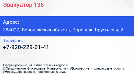 Эвакуатор-136 по адресу 394007, Воронежская область, Воронеж, Брусилова, 2 в дальнейшем Организация, размещена в следующих категориях: