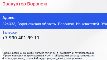 Эвакуатор Воронеж по адресу 394033, Воронежская область, Воронеж, Изыскателей, 39а в дальнейшем Организация, размещена в следующих категориях: