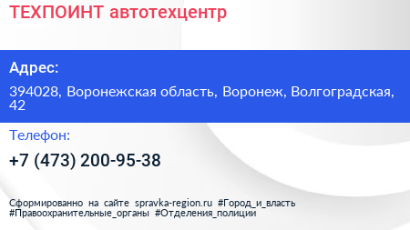 ТЕХПОИНТ, автотехцентр по адресу 394028, Воронежская область, Воронеж, Волгоградская, 42 в дальнейшем Организация, размещена в следующих категориях: