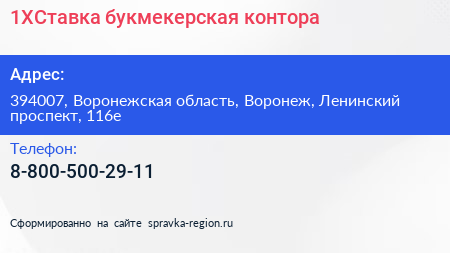 1XСтавка, букмекерская контора по адресу 394007, Воронежская область, Воронеж, Ленинский проспект, 116е в дальнейшем Организация, размещена в следующих категориях: