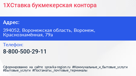 1XСтавка, букмекерская контора по адресу 394052, Воронежская область, Воронеж, Краснознамённая, 79а в дальнейшем Организация, размещена в следующих категориях: