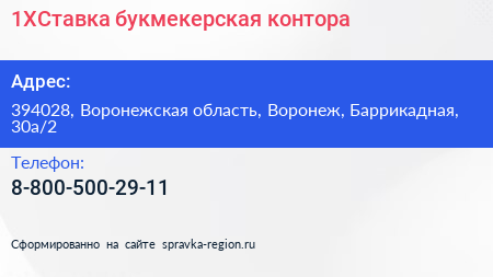 1XСтавка, букмекерская контора по адресу 394028, Воронежская область, Воронеж, Баррикадная, 30а/2 в дальнейшем Организация, размещена в следующих категориях: