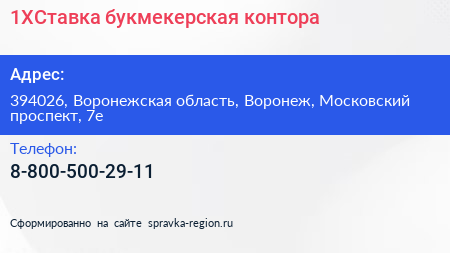 1XСтавка, букмекерская контора по адресу 394026, Воронежская область, Воронеж, Московский проспект, 7е в дальнейшем Организация, размещена в следующих категориях: