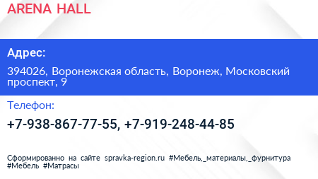 ARENA HALL по адресу 394026, Воронежская область, Воронеж, Московский проспект, 9 в дальнейшем Организация, размещена в следующих категориях: