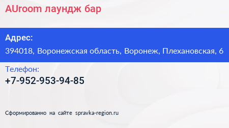 AUroom, лаундж-бар по адресу 394018, Воронежская область, Воронеж, Плехановская, 6 в дальнейшем Организация, размещена в следующих категориях: