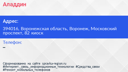 Аладдин по адресу 394016, Воронежская область, Воронеж, Московский проспект, 82 киоск в дальнейшем Организация, размещена в следующих категориях: