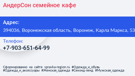 АндерСон, семейное кафе по адресу 394036, Воронежская область, Воронеж, Карла Маркса, 53 в дальнейшем Организация, размещена в следующих категориях: